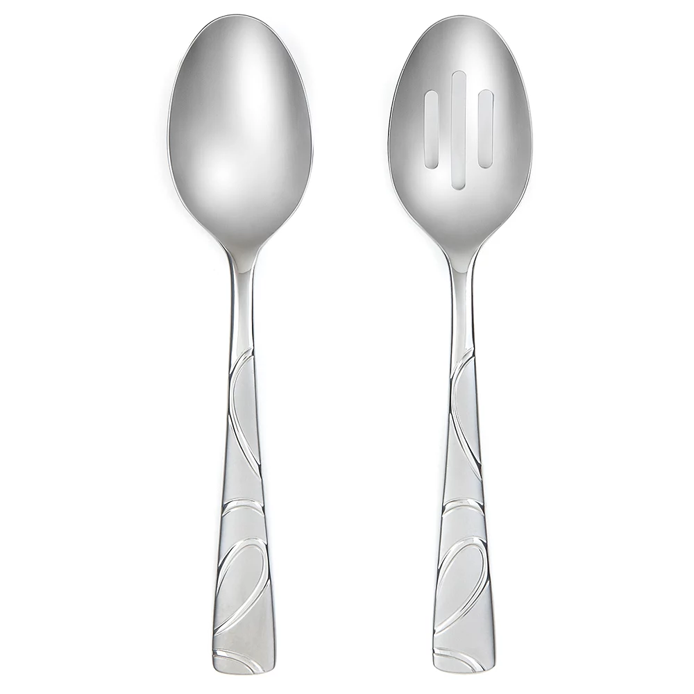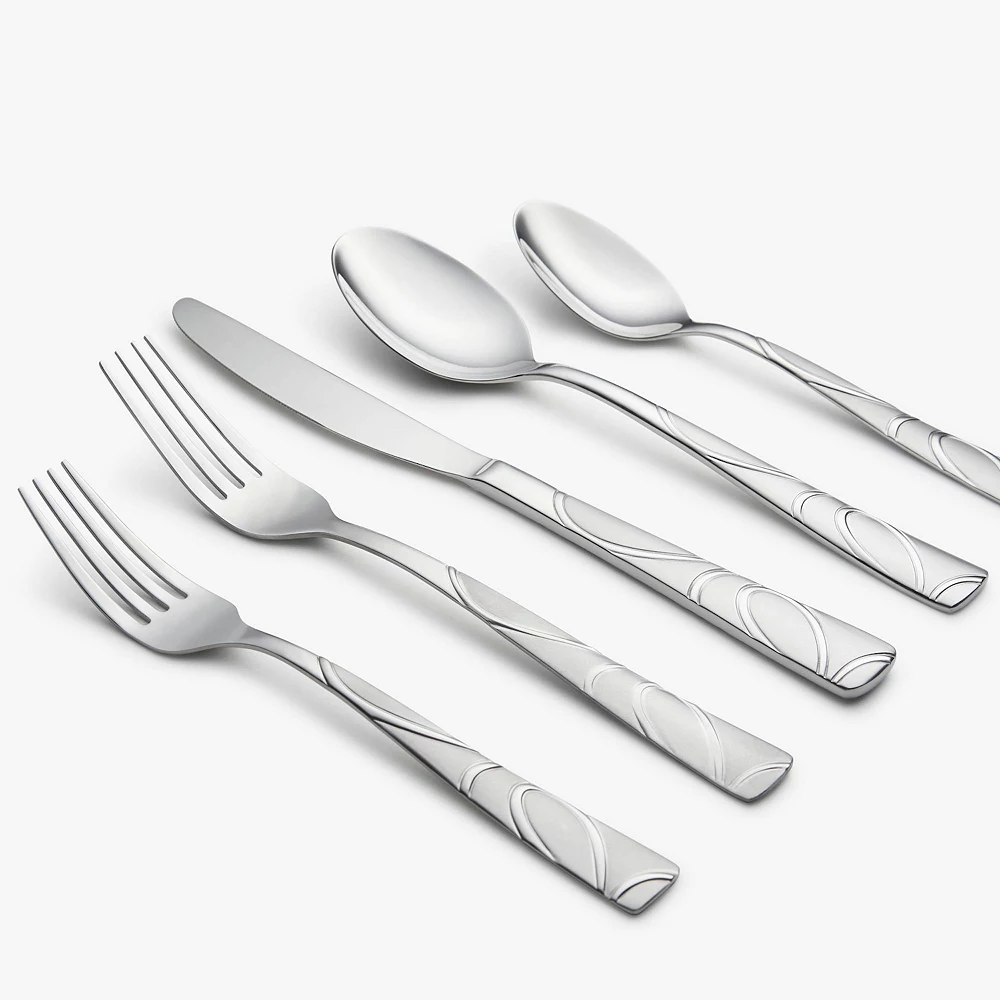Decorate the dinner table with this Cambridge Sasha Sand flatware. With sleek chrome ribbon accents on each handle, this set is sure to make an elegant addition to any meal.