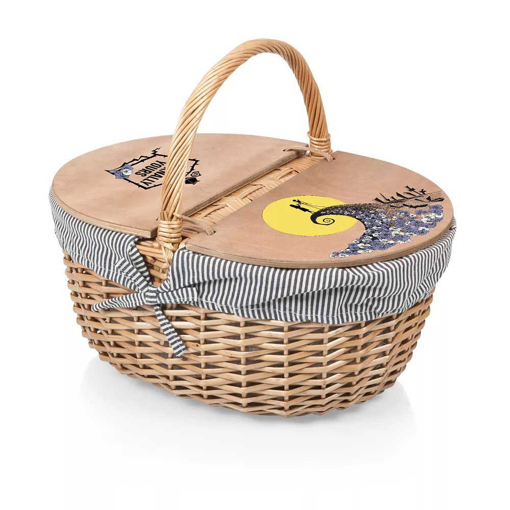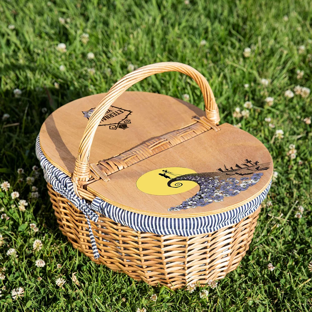 The Nightmare Before Christmas Jack and Sally Country Picnic Basket by Picnic Time is a classic English-inspired split lid large wicker picnic basket for two.