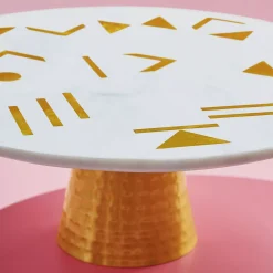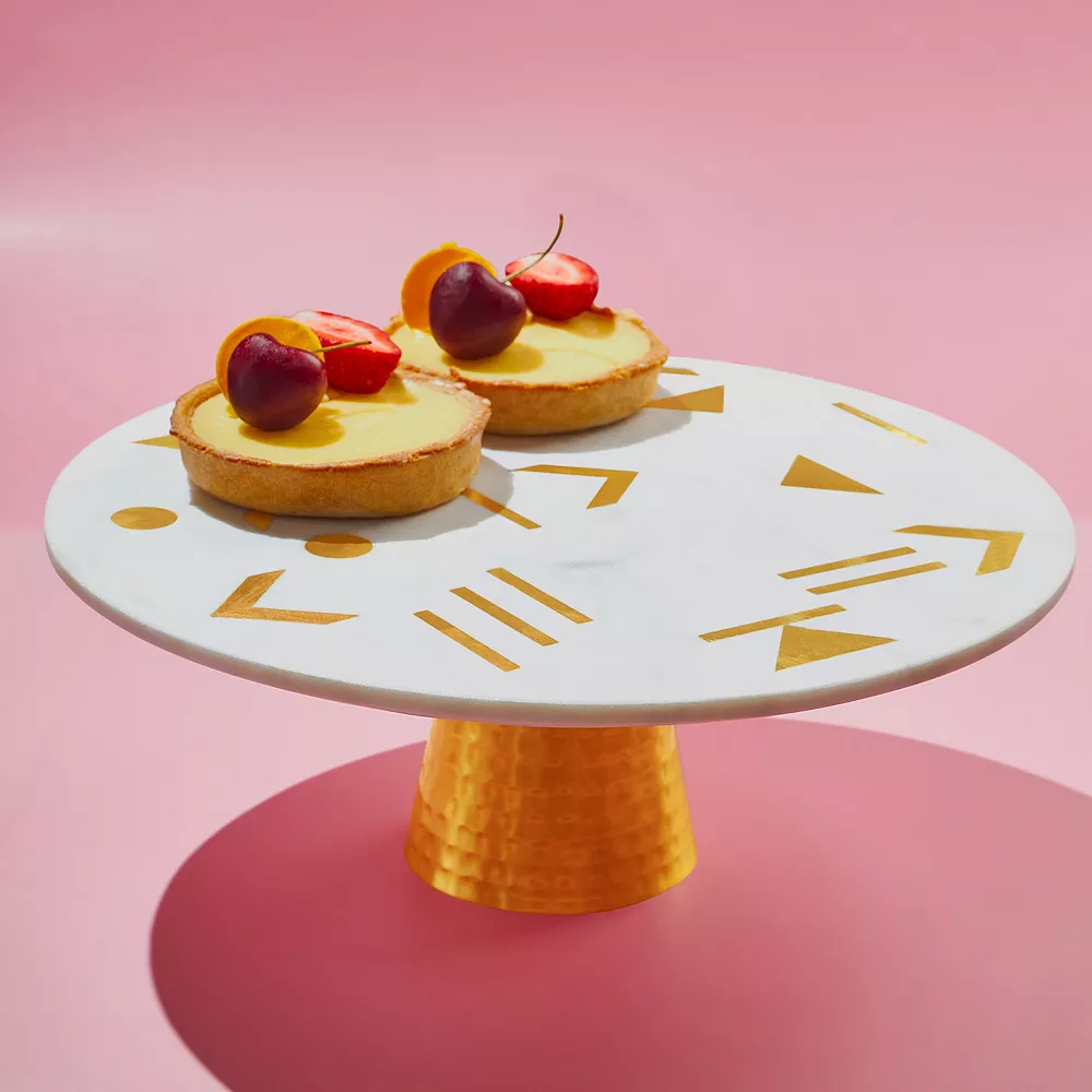 Show off your baking skills by elevating your cakes, pies, tarts, and so much more, on this hand carved round cake stand. Embellished with gold inlay, your baked goods will steal the show on this stand, at any wedding, birthday party, baby shower, anniversary, and more! The marble top and gold metal base of this piece blends perfectly with modern and contemporary aesthetics.
