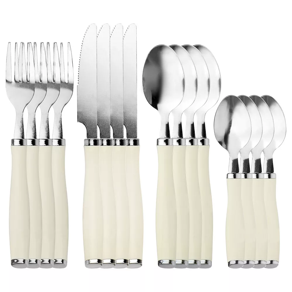 The Gibson Everyday Fairfield 16 piece flatware set with wire caddy, offers a simple solution to your every day dining and storage needs. This set is perfect to have when you need more flatware to cover extra guests in your home, or if you simply don’t have much space left in your kitchen drawers, place your flatware on the countertop and problem solved! This dishwasher safe flatware is made with stainless steel utensils and plastic handles. Metal caddy has four sections to keep each utensil type separated.