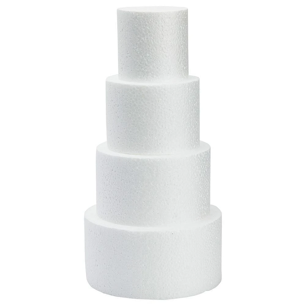 Design and create a faux wedding cake for an upcoming birthday party, wedding reception, baby shower, gender reveal, anniversary, or engagement party. The white craft foam has a smooth surface that can easily be decorated with faux flowers, cake toppers, fondant, and modeling chocolate to coordinate with any special occasion. But why stop at just making an ordinary cake? The cake foam dummies are also great for making customized diaper cakes, money cakes, and flower cakes! Each foam circle set comes in 4 assorted sizes that measure 3 x 3 inches, 4 x 3 inches, 5 x 3 inches, and 6 x 3 inches to create a 12-inch tall cake display when stacked together.