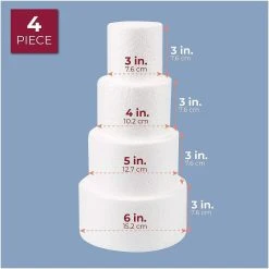 - Dimensions: From smallest to largest, the foam circles tiers measure 3 x 3 inches, 4 x 3 inches, 5 x 3 inches, and 6 x 3 inches; stacked together, the cake foam stands 12 inches tall