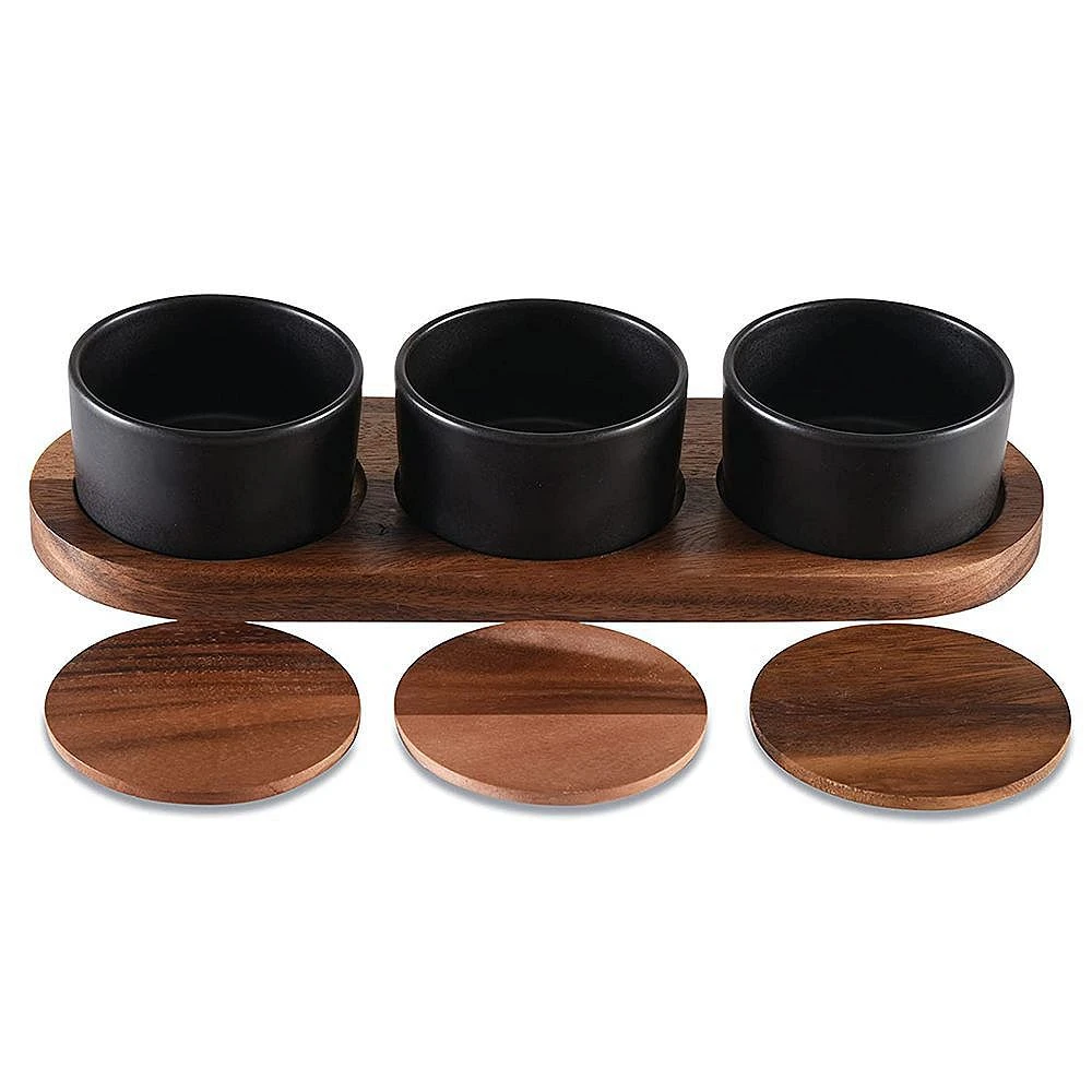 Beautiful set of 3 black ceramic bowls with acacia wood lids sit atop an acacia wood base. Bowl area routed out just enough to prevent unnecessary movement and avoid spillage. Each bowl comes with an acacia wood lid. Ceramic bowl is perfect for dips, salsas, dressings and quesos and is dishwasher safe. Handcrafted from solid acacia wood, a high-quality hardwood great for culinary applications. Cleans up easily by wiping with a damp cloth.