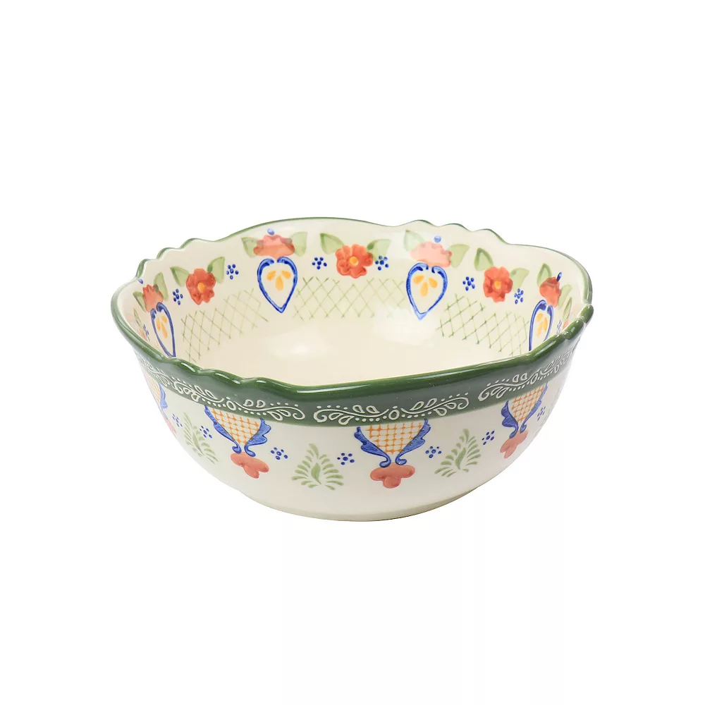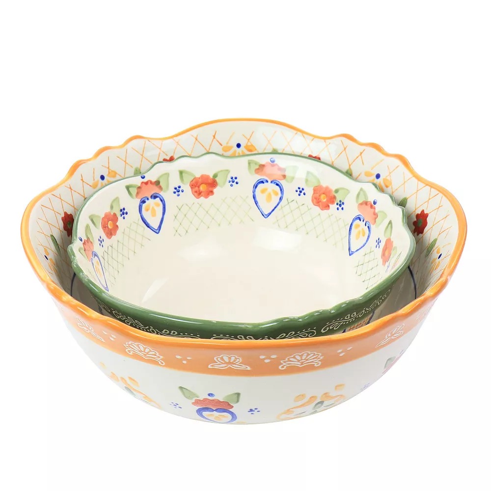 Serve your favorite sides to all your guests with the Laurie Gates Tierra 2 piece stoneware bowl set in floral. The beautifully hand painted design will surely be the perfect addition to any table setting for any occasion. Complete with one 10 inch 2.7 quart and one 7.8 inch 1.9 quart bowl set. Made of quality stoneware. Both bowls are dishwasher and microwave safe.