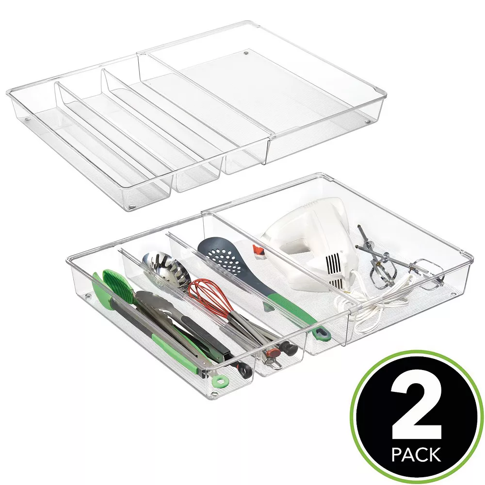 Rummaging through messy and disorganized kitchen drawers becomes a thing of the past with the Kitchen Drawer Organizers from mDesign. Make the most of your storage space by customizing the tray to the exact width of the drawer. Four compartments provide plenty of room for storing all your kitchen utensil essentials. The clear plastic construction makes seeing what’s stashed inside simple, while the open tops make grabbing what you need when you need it a breeze. Non-skid feet and ridges on the bottom of each organizer stop it from sliding out of place. mDesign – Solutions for Home. Solutions for Life.