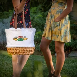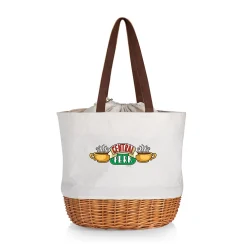 The Central Perk Coronado Basket is a roomy picnic tote bag featuring a willow wicker bottom, canvas body, fully-lined interior and Friends logo.