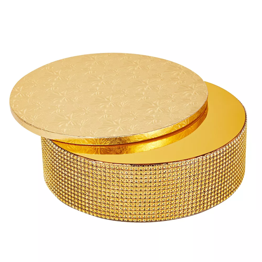 - Reliable Quality: The 12 inch cake drum is made of cardboard wrapped in gold metallic foil; stand is lightweight and made of polystyrene foam and cardboard decorated with faux rhinestone ribbon