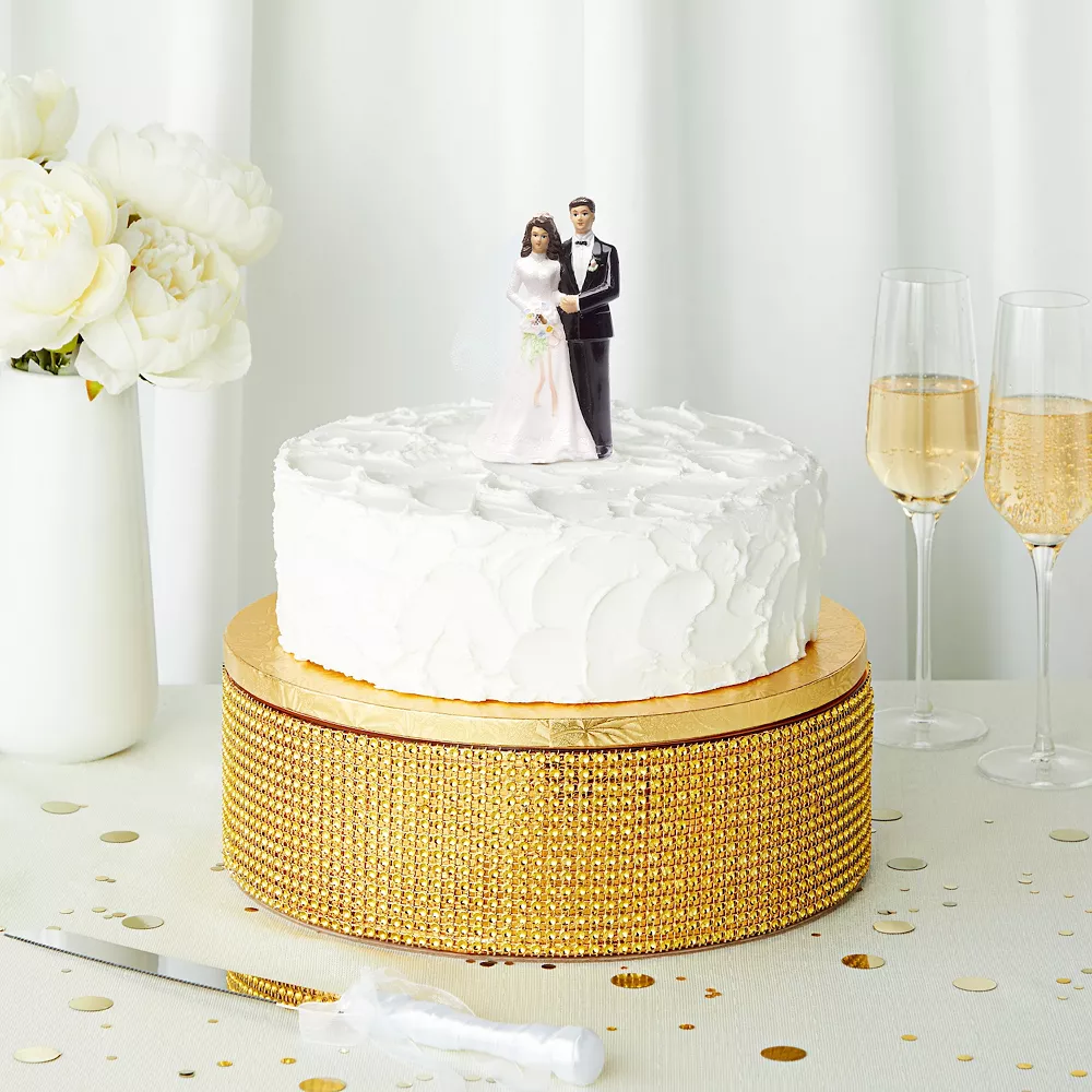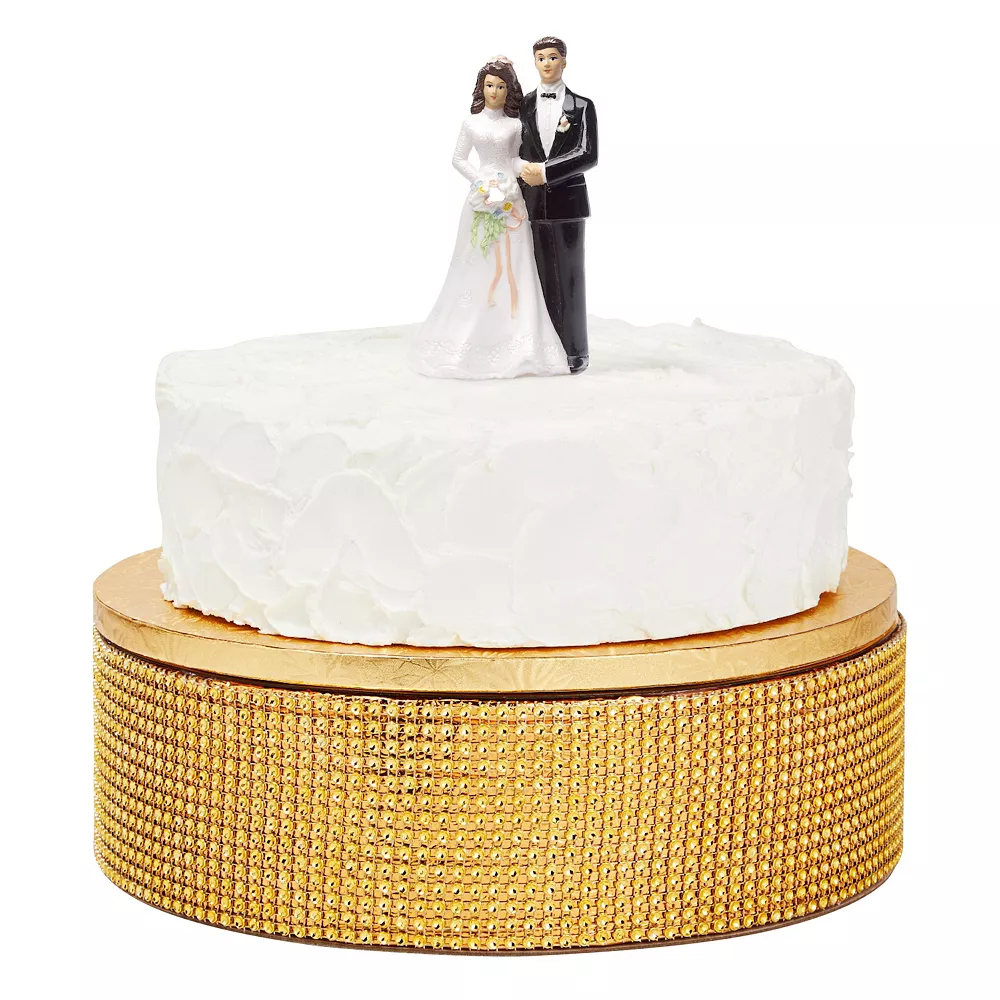 Display your delicious desserts for an upcoming event or family gathering on this 2 piece gold rhinestone cake stand and cake drum set. This small round gold cake stand is perfect for weddings, birthday parties, baby showers, anniversaries, quinceanera, bridal showers, engagement parties, or even a retirement party! The 12-inch cake stand and 12-inch cake drum are perfect for displaying small cakes and pastries. Note: Please remove the film before using the cake stand.