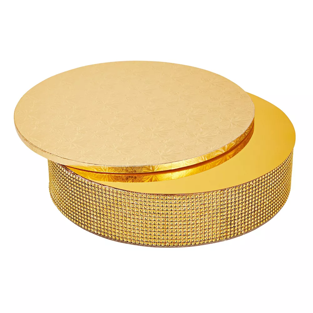 - Rhinestone Cake Stand Set: Add an elegant and sophisticated touch to your upcoming celebration with this gold cake base stand and drum to display a wedding cake, cupcakes, or small treats