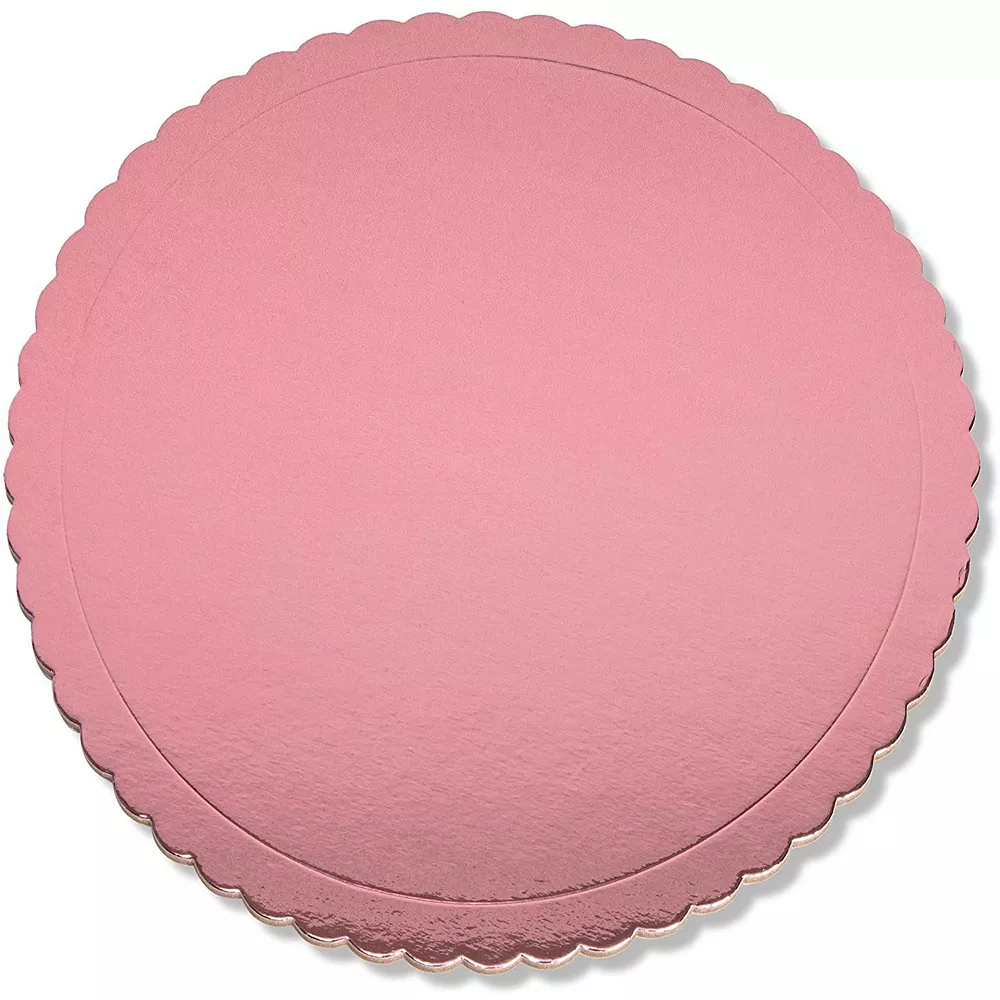This rose gold scalloped cake board set can be used for serving delicate appetizers, desserts, and other culinary treats. The sturdy embossed board looks luxurious and delicate, and it is perfect for decorating and transporting cakes and other desserts.